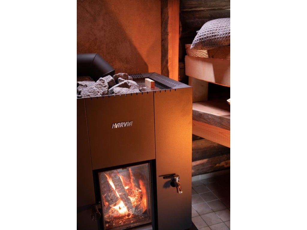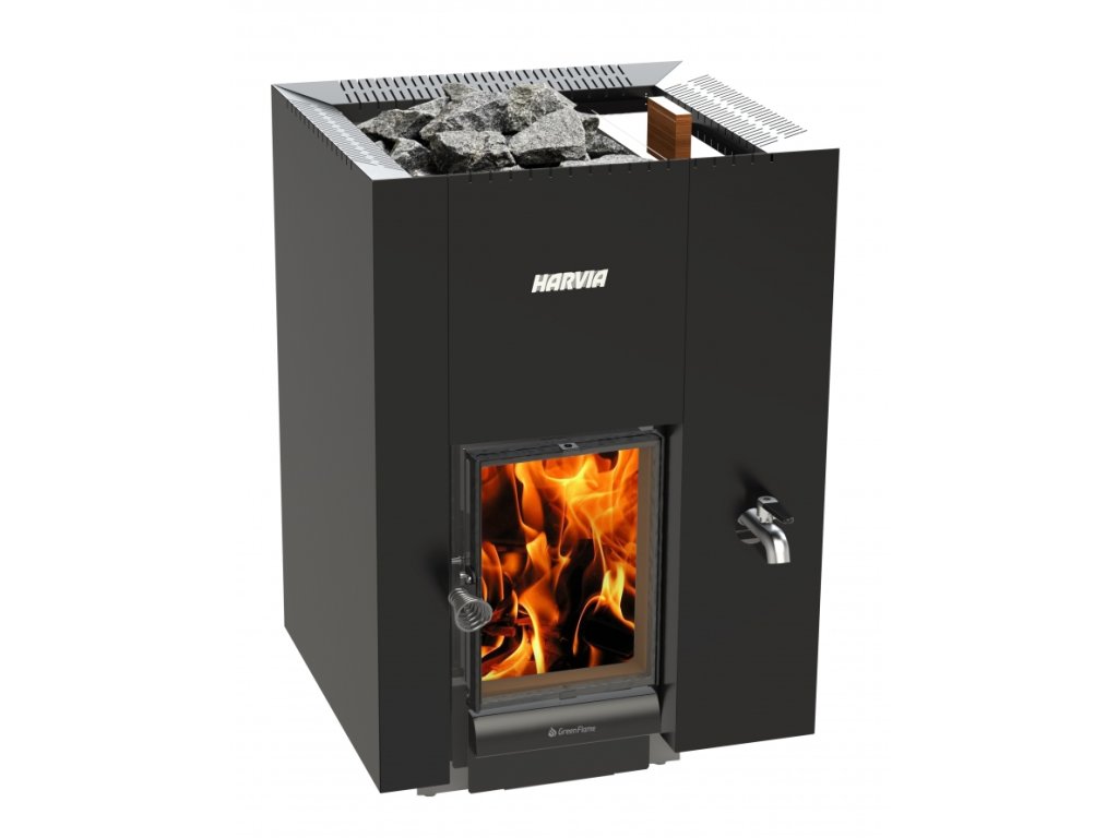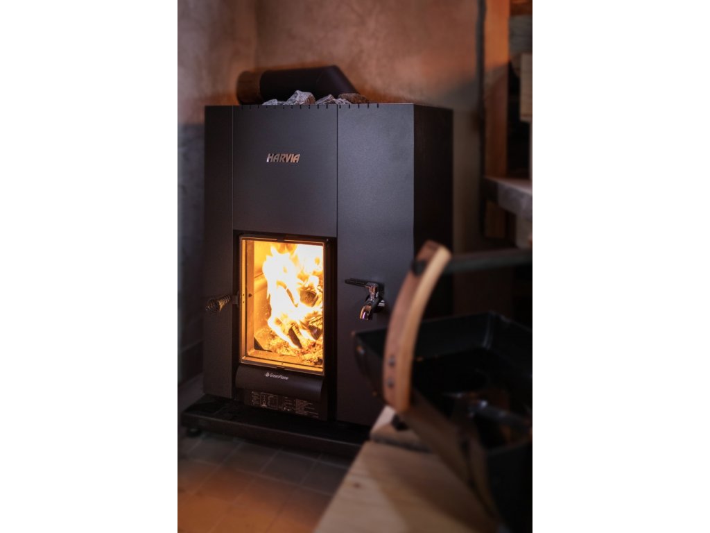 Originální finská saunová kamna pro vytápění dřevem. Saunová kamna HARVIA Linear 22 GreenFlame RS o výkonu 15,7 kW v ještě lepším provedení, která umožňují efektivnější hoření – šetří tím životní prostředí a snižují oxid uhelnatý až o 70%, úsporu paliva o 25% a delší dobu hoření o 100%. Na rozdíl od původní verze mají větší topeniště a větší skleněný průhled. Součástí kamen je nádrž pro ohřev vody o objemu 30 litrů, vypouštění na pravé straně.